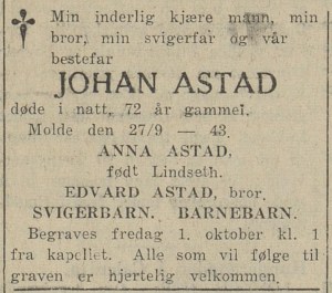 I 1891 er Johan Martinus Olsen Astad på Lofotfiske med “jegten Freya”. Senere er han oppført med forskjellige yrker; jord- og stenarbeider, ølkjører og brannkonstabel.