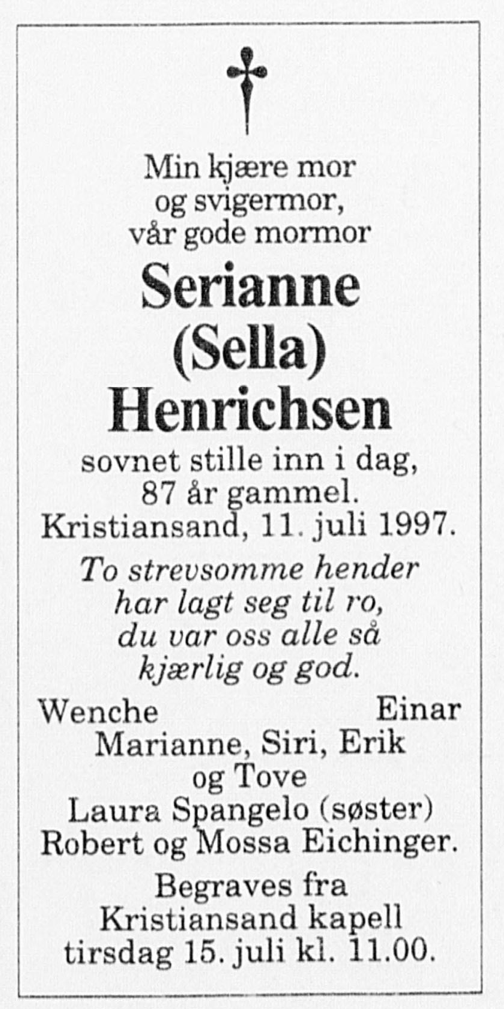 Serianna Baardsdatter Henrichsen, født Rypdal, ble gift med Kurt Henrichsen fra Kristiansand og bosatte seg der.