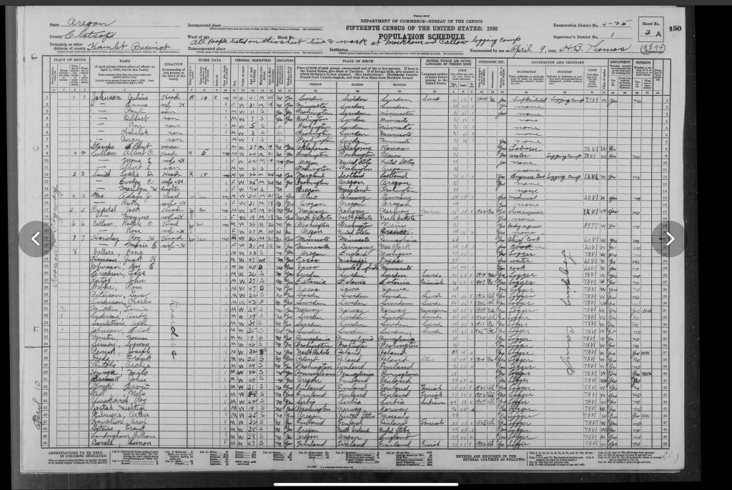 Census (Folketelling) april 1930, State of Oregon, Clatsop County, Hamlet Precinct. Roosevelt Styway (?)