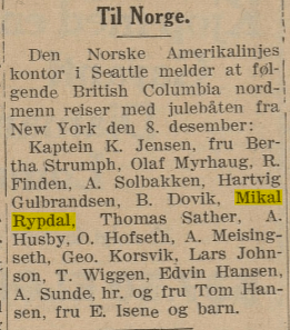 Mikal Baardson Rypdal Mikal Baardson Rypdal kom tilbake fra USA/Canada da faren Baard døde, og tok over farsgarden på Rypdal. Kom hjem med julebåten i desember 1937, Vancouverposten Sunnmørsposten 01.11.1944