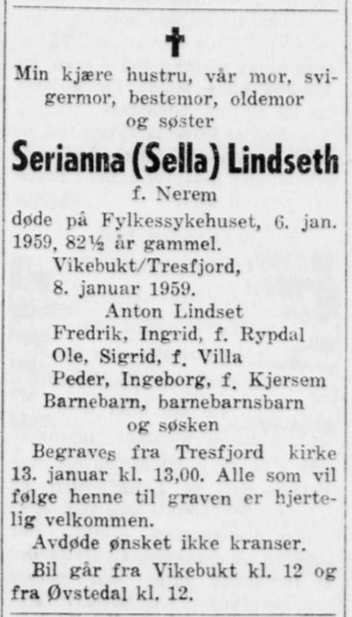 Sella (Serianna) Fredrikke Pedersdatter Lindset, født Nerem, 1876-1959