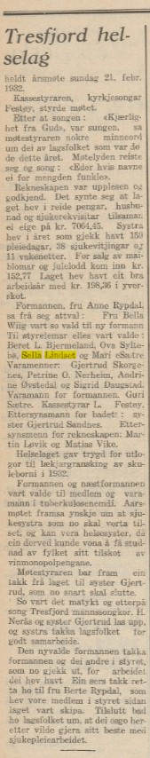 Sella var nok oppegående ellers også, og engasjerte seg blant annet i Tresfjord helselag, der hun var med i styret i flere år på begynnelsen av 30-tallet.